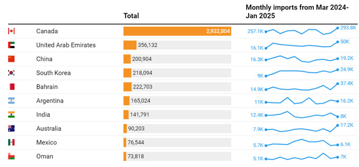 与钢铁不同,中国是美国铝进口的前三大来源国。2023年美国铝材进口总量为164.82万吨,其中从加拿大、中国和墨西哥进口的铝材分别为42万吨、20万吨和6万吨,总计占美国铝材进口的41.7%。不过,到2024年,加拿大在美国的铝供应中已占据绝对优势地位。根据2024年3月至2025年1月的数据,加拿大供应了美国近40%的进口铝,总计近300万吨。阿联酋弯道超车,成为美国第二大铝进口国,中国则后移到了第三位。