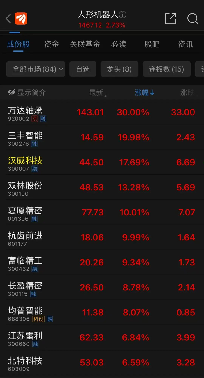 人形机器人概念今天继续大涨。万达轴承连续第二日收获30%幅度涨停,长盛轴承午后大涨超15%,股价再创历史新高,较去年2月低点涨幅超10倍。