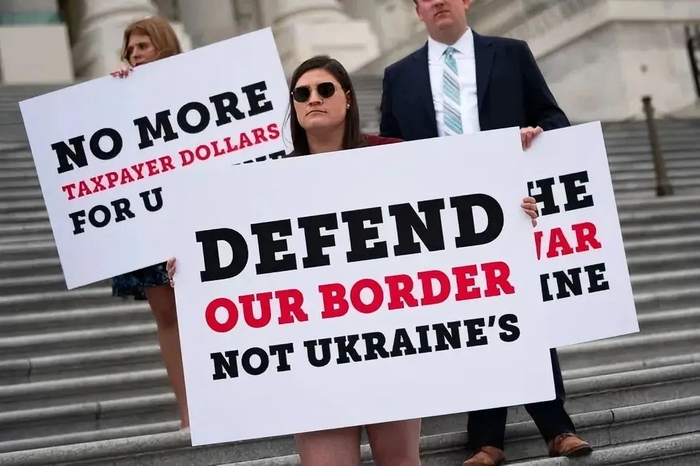 美国民众手持反对援助乌克兰的标语在国会山前抗议。