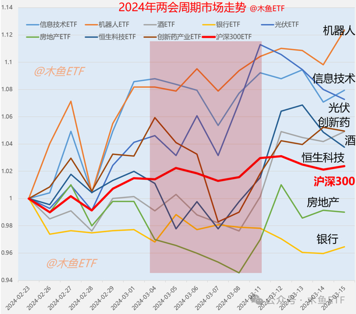 那么我们再看看2024年两会周期前后主要主题ETF的走势。