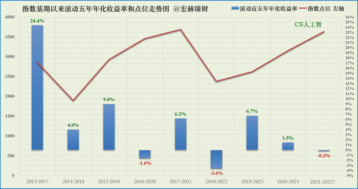 该指数自2012/06/29日基期以来迄今历经12.7年,由1000点走至3631.03点,年化收益率:10.69%;近5年年化为-0.17%,同期中证A500指数为 0.27%。