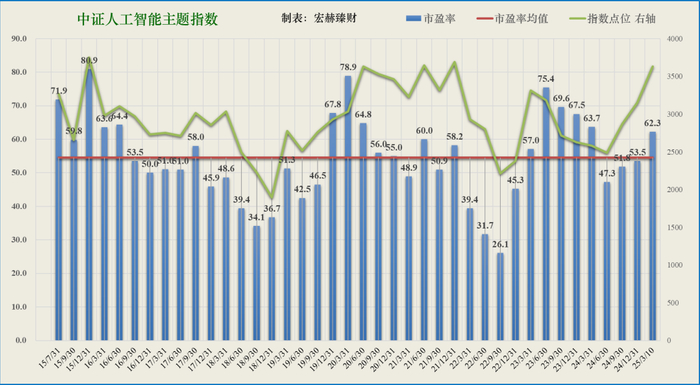 中证人工智能主题指数于2015年07月31日启用,启用日市盈率为72倍,当前62倍。启用以来季度平均市盈率为55倍,启用以来历经9.61年,点位从3268.53点走至3631.03点,年化收益率1.10%