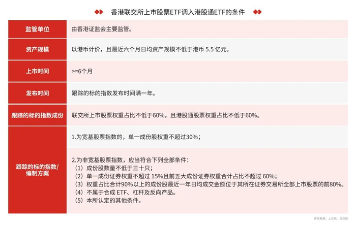对于后者,从2022年港股ETF纳入深港通和沪港通后,为了进一步扩大互联互通的范围,2024年6月,上交所、深交所分别发布《上海证券交易所沪港通业务实施办法(2024年修订)》《深圳证券交易所深港通业务实施办法》,明确了港股ETF纳入沪深港通的新规定:(资料来源:上交所、深交所)