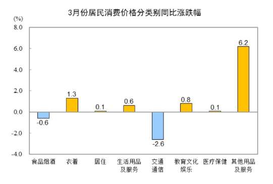 3月份,食品烟酒类价格环比下降0.9%,影响CPI下降约0.24个百分点。食品中,鲜菜价格下降5.1%,影响CPI下降约0.11个百分点;蛋类价格下降2.7%,影响CPI下降约0.02个百分点;畜肉类价格下降2.2%,影响CPI下降约0.07个百分点,其中猪肉价格下降4.4%,影响CPI下降约0.06个百分点;鲜果价格下降1.6%,影响CPI下降约0.03个百分点。