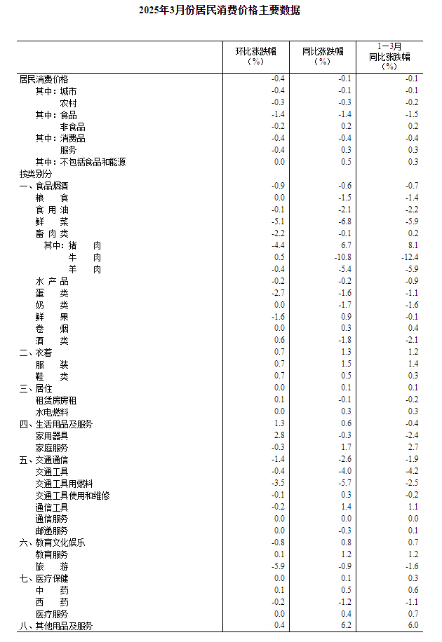 2025年3月份,全国居民消费价格同比下降0.1%。其中,城市下降0.1%,农村下降0.3%;食品价格下降1.4%,非食品价格上涨0.2%;消费品价格下降0.4%,服务价格上涨0.3%。1—3月平均,全国居民消费价格比上年同期下降0.1%。