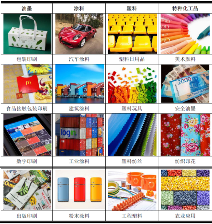 公司颜料产品具有耐光、耐热、耐气候、耐迁移、环境友好和安全性能高的特点,主要应用于油墨、涂料、塑料和特种化工品着色,其中油墨是最重要的应用领域,占比约为40-50%。公司产品最终广泛应用于包装印刷、食品接触包装印刷、数字印刷、出版印刷、汽车涂料、建筑涂料等。