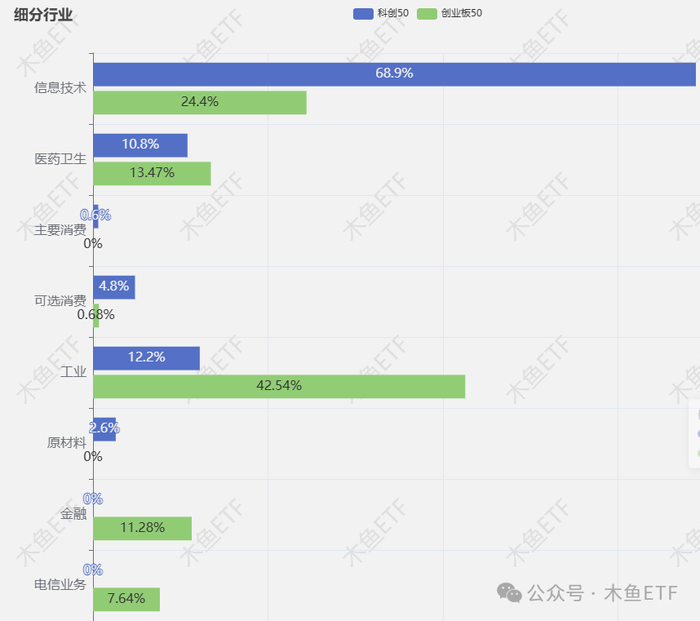 从行业分布上来看,科创50中信息技术占比近7成是最大的特色,而创业板50中工业(含新能源、工业制造)等占比超过4成明显超过了科创50。