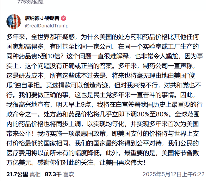 他在帖子中写道:“我们的国家终于将获得公平待遇,我们公民的医疗成本将以前所未有的幅度下降。”