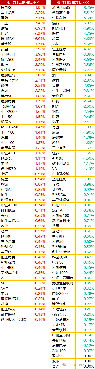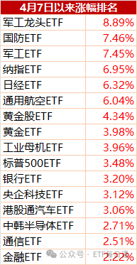 而超过4月7日开盘的ETF也有不少,一个是受益于印巴冲突的军工类,这个和贸易无关,只是现在显得不算很便宜。但我们分析了,军工也是重估行情,短期是炒,长期是投。