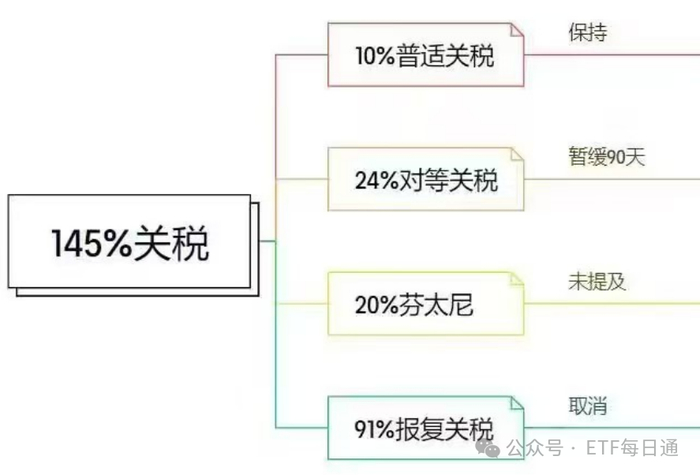 简单点,就是把“互惠”税率从 125% 削减至 10%。那么总体加减数上,美国将把对中国商品征收的145%的降至30%,而中国将把对美国进口商品征收的125%的降至10%。多出的那20%是之前芬太NI的,还没处理。