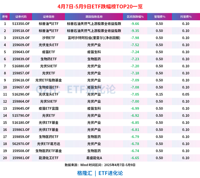 从ETF在4月7日-5月9日的区间涨跌幅业绩来看更明显,跌幅TOP20的ETF产品中,一半都是跟踪光伏产业指数的ETF。