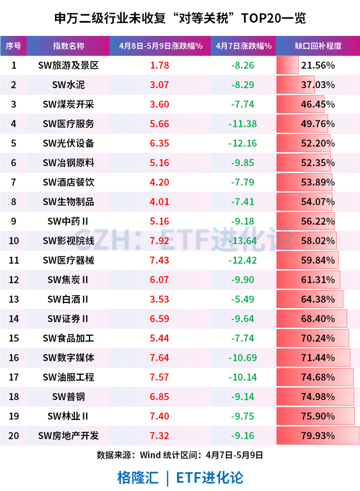 而申万二级行业中依然未收复“对等关税”失地的有:旅游、水泥、煤炭、医疗服务、光伏设备等,其中光伏设备行业截至5月9日的缺口修复程度刚过半。