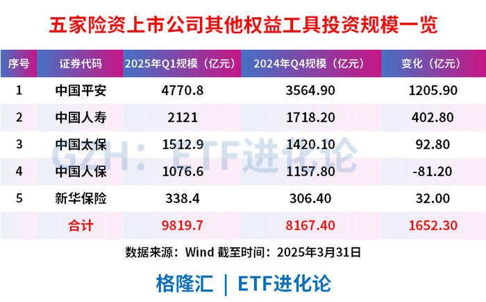 平安、国寿、太保、人保、新华合计的其他权益工具投资规模总额达到9819.7亿元,相比去年年末增加了1652亿元,恰好就是第二批长期股票投资试点的规模(1620亿)。