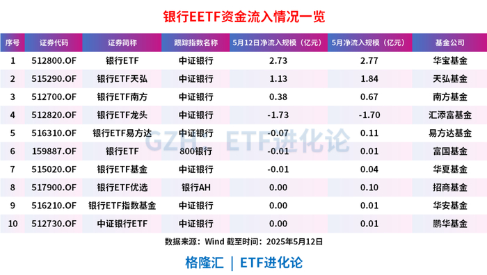 华宝银行ETF、银行ETF天弘单日净流入2.73亿元和1.13亿元。