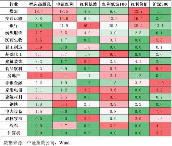 从整体行业分布来看,中证智选高股息指数行业分布相比其他同类红利指数更加均衡。权重占比最高的行业为煤炭、交通运输、银行,且前三大行业的合计占比大幅低于其他红利类指数。