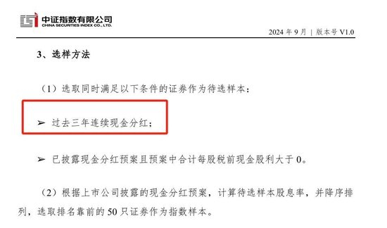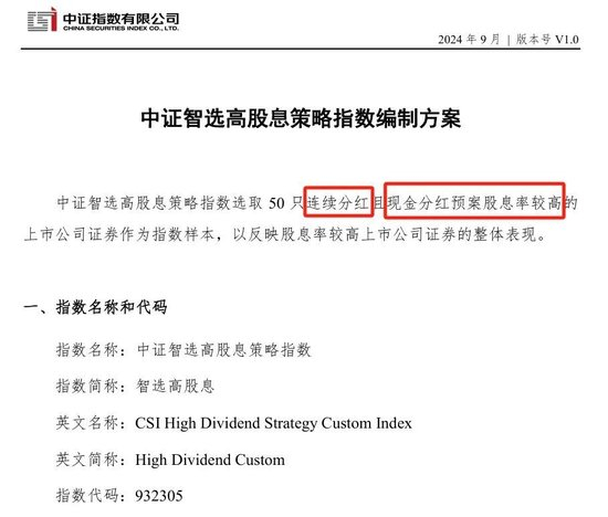 这个中证智选高股息策略指数特点就是根据分红预案进行选股——选取50只连续分红且现金分红预案股息率较高的上市公司证券作为指数样本。
