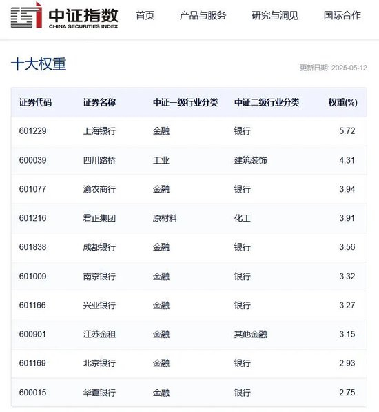 这是中证指数公司官网公布的截至5月12日,也就是调仓之前的这一指数前十大样本股:7个银行,1个金融租赁(类银行),前十家里面只有2家非金融行业个股。