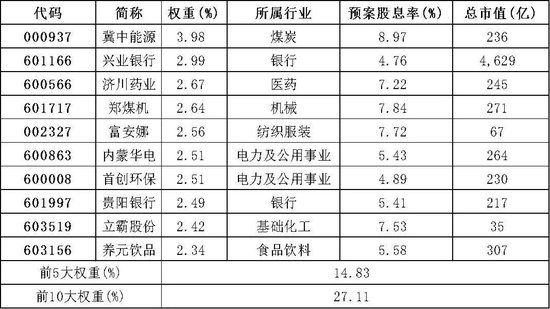 指数样本调整后,前十大成分股合计权重占比27.1%,相比其他红利类指数在权重上更加均衡,且入选的成分股的分红预案股息率均维持在较高水平。