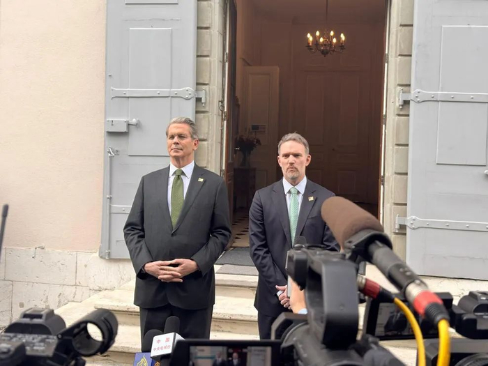 ▲5月11日,美国财政部长贝森特和贸易代表格里尔与中方举行经贸谈判后出席记者会。
