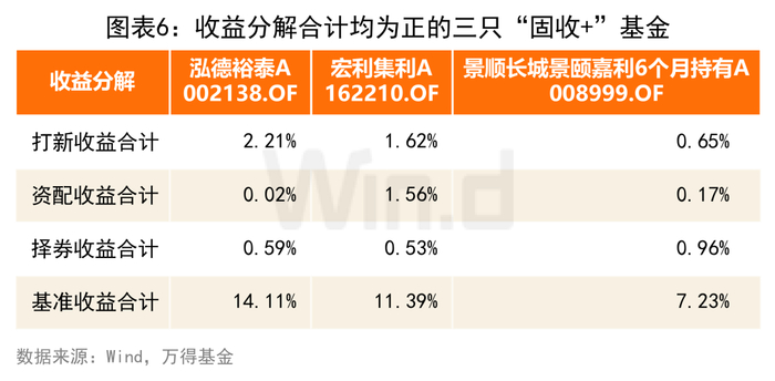 值得一提的是,有3只“固收+”基金表现突出,打新收益、资配收益合计、择券收益合计、基准收益合计在上述三个统计区间的和均为正值。