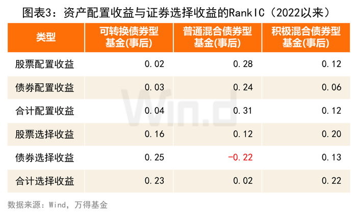 我们把事前分类为债券型基金,且万得事后分类为可转换债券型、普通混合债券型和积极混合债券型的所有基金进行了收益分解,计算了2022年内资产配置收益、证券选择收益与2023全年收益之间的RankIC,考察配置与择券能力的预测性。