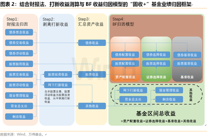 综合以上几点要求,我们采用财报和持仓数据,在测算综合网下打新收益后,使用BF模型对“固收+”基金进行收益归因。