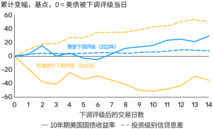 图表1:以往评级下调时美国国债收益率及投资级别信贷息差的改变