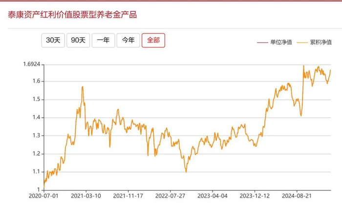 与泰康丰华不同的是,泰康红利价值从2024年年初就开始上涨,一直到年中之后有所调整,后又重新开始震荡上涨。