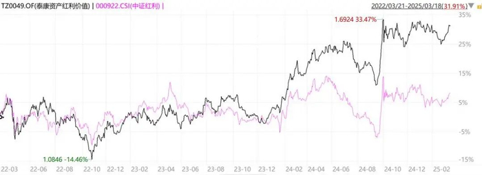 实际上,如果对比近3年,泰康红利价值与中证红利的表现可以看出,一方面它与红利指数整体趋势相当接近,“吃到了”2024年上涨的“红利”。
