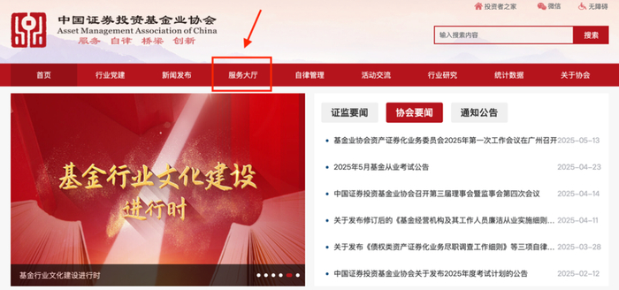 第一步:浏览器搜索“中国证券投资基金业协会”或打开中国证券投资基金业协会官网(https://www.amac.org.cn/),选择“服务大厅”。