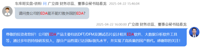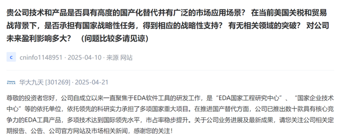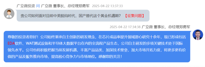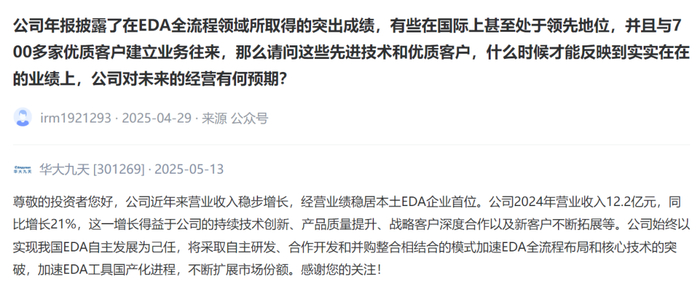 A股投资者在互动平台上的询问集中于于广立微、华大九天,全景为您精选来自上市公司最真实的声音。(以下内容均摘自深交所互动易、上证e互动、上市公司公告、业绩说明会等)