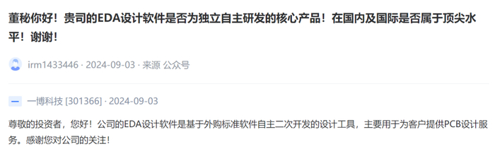 一博科技[301366] :公司的EDA设计软件是基于外购标准软件自主二次开发的设计工具,主要用于为客户提供PCB设计服务。