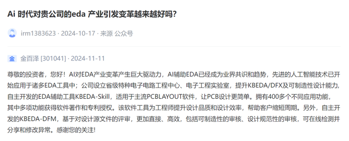 金百泽[301041] :AI对EDA产业变革产生巨大驱动力,AI辅助EDA已经成为业界共识和趋势,先进的人工智能技术已开始应用于诸多EDA工具中;公司设立省级特种电子电路工程中心、电子工程实验室,提升KBEDA/DFX及可制造性设计能力,自主开发的EDA辅助工具KBEDA-Skill,适用于主流PCBLAYOUT软件,让PCB设计更简单。拥有400多个不同应用功能,其中多项功能获得软件著作和专利授权。该软件工具为工程师提升设计品质和设计效率,帮助客户缩短周期。另外,自主开发的KBEDA-DFM,基于对设计源文件的评审,更加直接、高效,包括可制造性的审核、设计规范性的审核,可在线检测并分享和修改异常。
