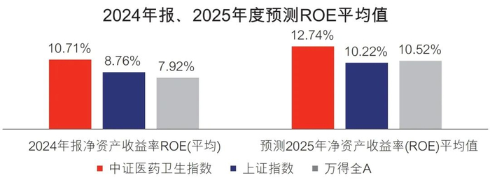 行业维持相对高成长:中证医药指数2024年报ROE平均值、2025年度预测ROE平均值,明显好于上证指数和万得全A指数。