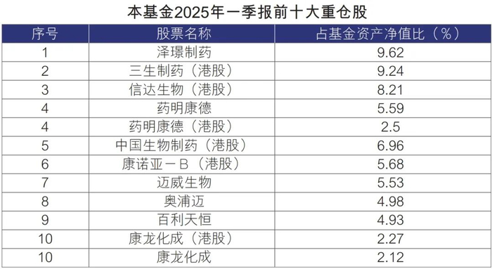 高纯度:不低于80%的非现金资产投资于医疗先锋主题的股票。据2025年基金一季报,前十大重仓股主要分布于创新药、CXO、中药、生物制品等医药细分领域。