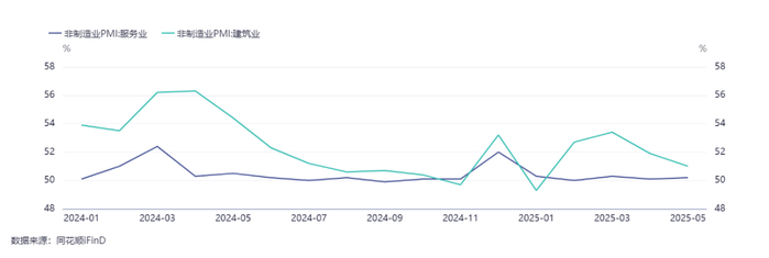 5月服务业PMI为50.2,回升0.1个百分点,但略低于季节性规律。在五一假期的带动下,餐饮旅游、交通运输等行业景气度明显回升。建筑业PMI指数为51.0%,回落0.9个百分点,但土木工程建筑业指数为62.3,比上月上升1.4个百分点,表明各地施工进度继续加快。