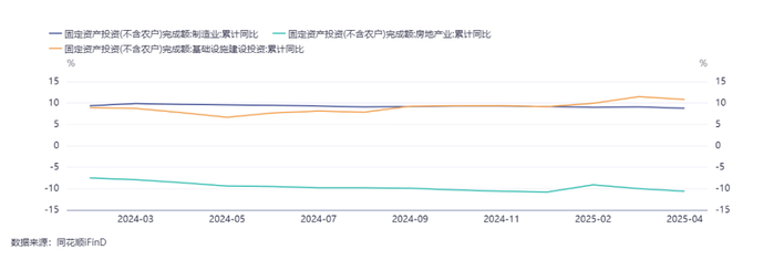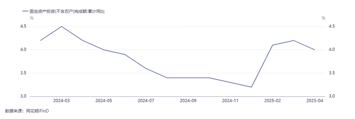制造业投资高位回落,1-4月累计同比8.8%,较前值回落0.3个百分点,略弱于市场预期。制造业维持高位与设备更新政策有关,但月度数据小幅回落或与出口拖累有关。纺织、通用设备、专用设备等行业投资有所回升,运输设备、医药、电子设备等行业增速回落较多。