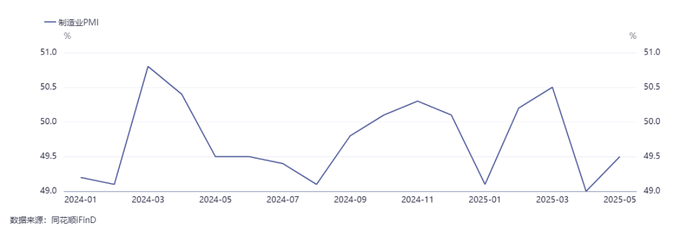 5月制造业PMI录得49.5%,较上月抬升0.5个百分点,表现有所改善,但继续处于荣枯分界线以下。