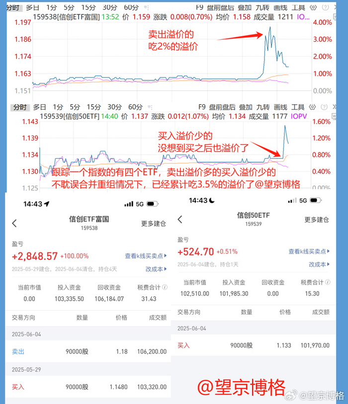 跟踪同一个指数的有4个ETF,卖出有溢价的,买入没有溢价的,不耽误重组的事情,还能吃溢价。第二次切换+第一次切换已经吃了3.5%的溢价了。