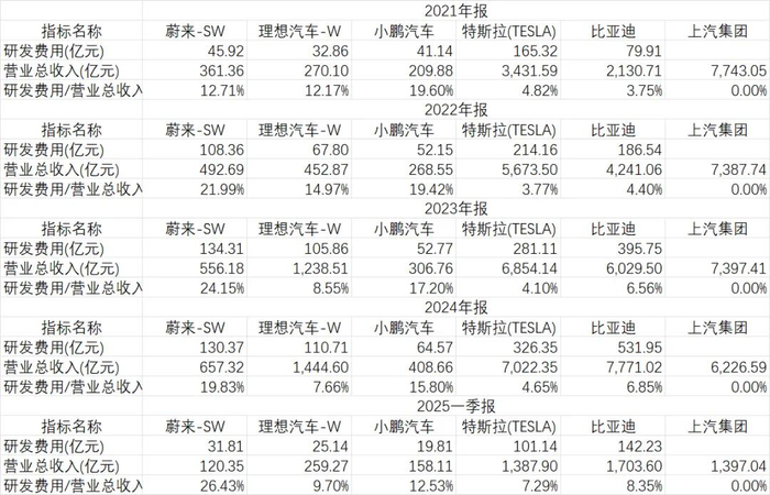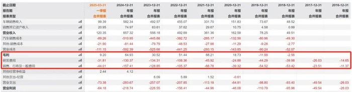 研发方面,据Wind数据显示,蔚来2022-2024年研发费用均超百亿(分别为108.36亿元、134.31亿元、130.37亿元),2025年一季度也达31.81亿元。