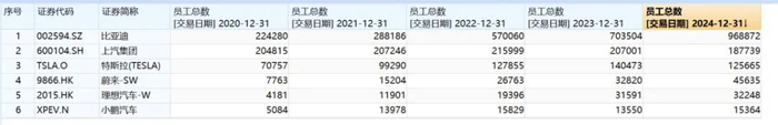 而其他公司比较保守,特斯拉在2024年员工人数还进行了缩减,小鹏和理想基本保持稳定。