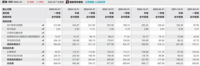 更严峻的是资产负债表的结构性风险。截至一季度末,蔚来的总负债高达908.49亿元,流动负债高达594.92亿元,比流动资产高出近百亿元。
