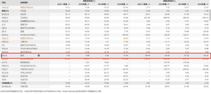 《财说消费》注意到,对比同行业蔚来的销售毛利率不仅处于较低水平,且其下行趋势与行业多数公司毛利率企稳向好的态势背道而驰。