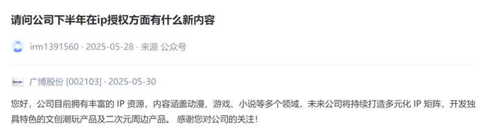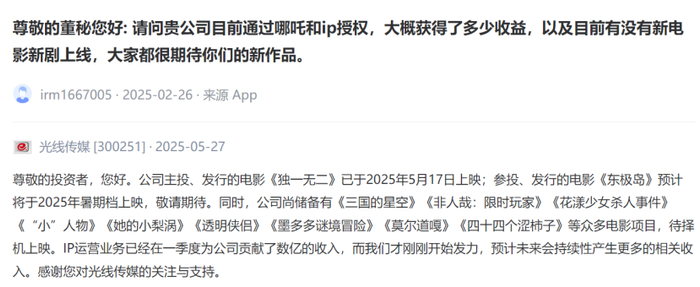 光线传媒 [300251] :公司主投、发行的电影《独一无二》已于2025年5月17日上映;参投、发行的电影《东极岛》预计将于2025年暑期档上映,敬请期待。同时,公司尚储备有《三国的星空》《非人哉:限时玩家》《花漾少女杀人事件》《“小”人物》《她的小梨涡》《透明侠侣》《墨多多谜境冒险》《莫尔道嘎》《四十四个涩柿子》等众多电影项目,待择机上映。IP运营业务已经在一季度为公司贡献了数亿的收入,而我们才刚刚开始发力,预计未来会持续性产生更多的相关收入。