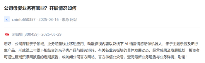 汤姆猫 [300459] :公司深耕亲子领域,业务涵盖线上移动应用、动漫影视内容以及线下 AI 语音情感陪伴机器人、亲子主题乐园及IP衍生产品,形成线上与线下相结合的亲子类产品与服务矩阵。