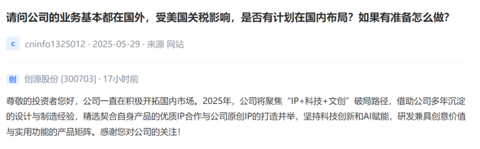 创源股份 [300703] :公司一直在积极开拓国内市场。2025年,公司将聚焦“IP+科技+文创”破局路径,借助公司多年沉淀的设计与制造经验,精选契合自身产品的优质IP合作与公司原创IP的打造并举,坚持科技创新和AI赋能,研发兼具创意价值与实用功能的产品矩阵。