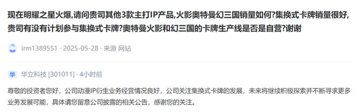 现在明耀之星火爆,请问贵司其他3款主打IP产品,火影奥特曼幻三国销量如何?集换式卡牌销量很好,贵司有没有计划参与集换式卡牌?奥特曼火影和幻三国的卡牌生产线是否是自营?