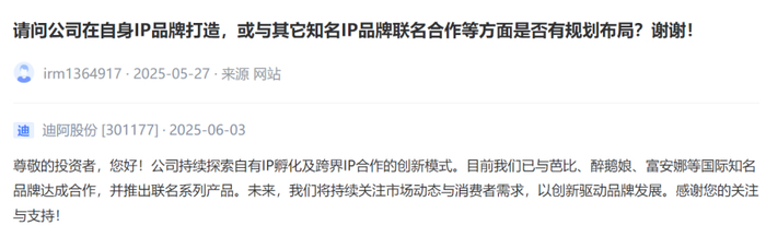 迪阿股份 [301177] :公司持续探索自有IP孵化及跨界IP合作的创新模式。目前我们已与芭比、醉鹅娘、富安娜等国际知名品牌达成合作,并推出联名系列产品。未来,我们将持续关注市场动态与消费者需求,以创新驱动品牌发展。