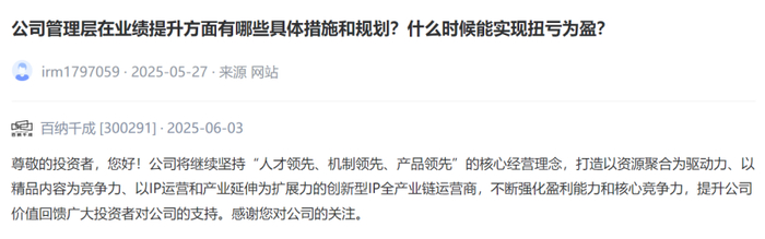 百纳千成 [300291] :公司将继续坚持“人才领先、机制领先、产品领先”的核心经营理念,打造以资源聚合为驱动力、以精品内容为竞争力、以IP运营和产业延伸为扩展力的创新型IP全产业链运营商,不断强化盈利能力和核心竞争力,提升公司价值回馈广大投资者对公司的支持。