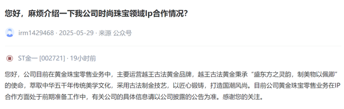 ST金一 [002721] :公司目前在黄金珠宝零售业务中,主要运营越王古法黄金品牌,越王古法黄金秉承“盛东方之灵韵,制美物以佩卿”的使命,萃取中华五千年传统美学文化,采用古法制金技艺,以匠心锻铸,打造国潮风尚。目前公司黄金珠宝零售业务在IP合作方面处于前期准备工作中。